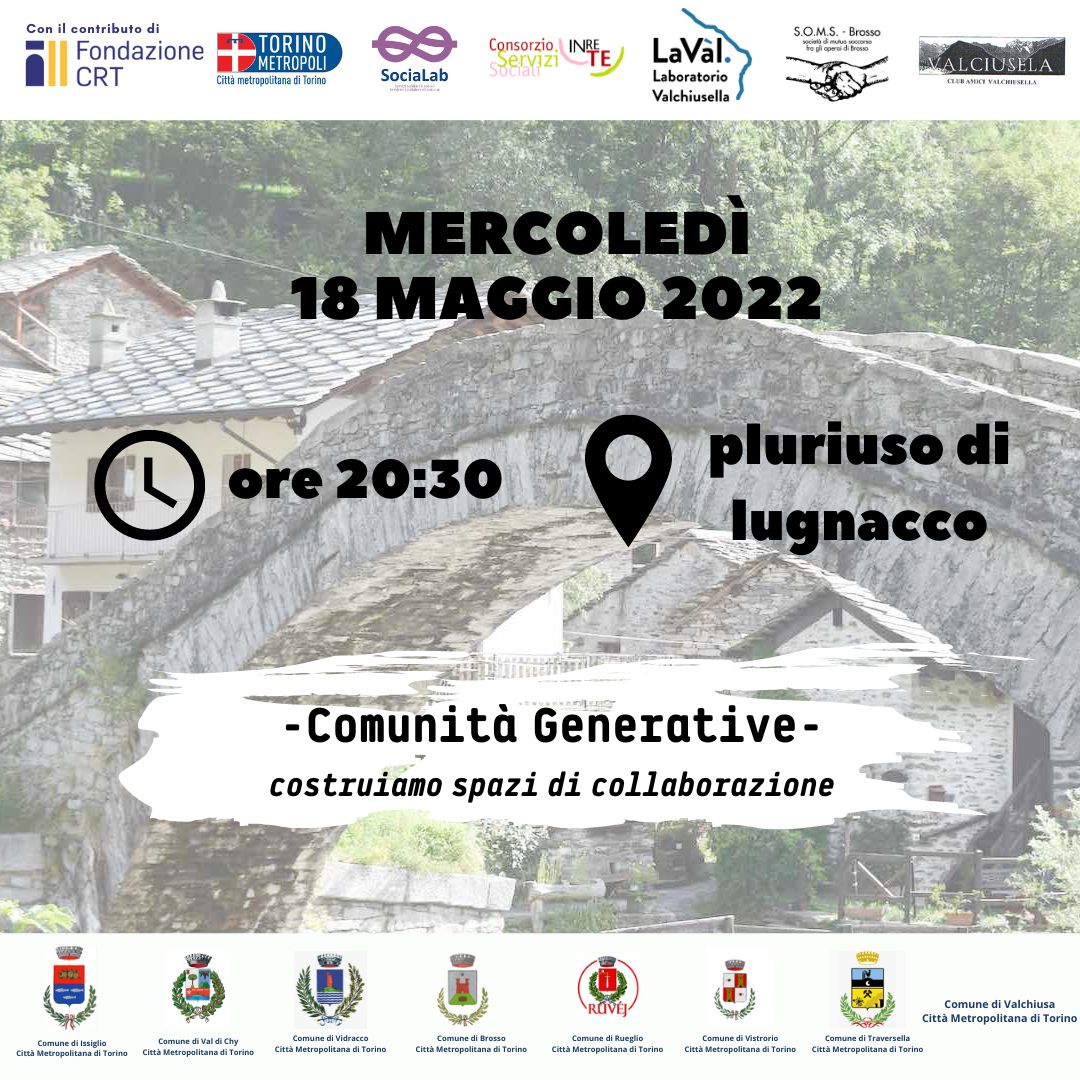 Inserita nel percorso del progetto SOCIALAB (Programmazione Europea di Sviluppo delle Aree Interne ALCOTRA) e finanziata con il Contributo di Fondazione CRT di Torino attraverso il progetto "Tessuti e Trame di un territorio - nuove vesti per un Welfare Comunitario", l'incontro "COMUNITÀ GENERATIVE - costruiamo spazi di collaborazione", è frutto di un lavoro iniziato a Marzo 2021 con le Associazioni della Valchiusella. La serata sarà dedicata ad avviare con le Associazioni presenti una riflessione operativa sul tema della collaborazione e sugli strumenti da attivare per migliorare la qualità della stessa.