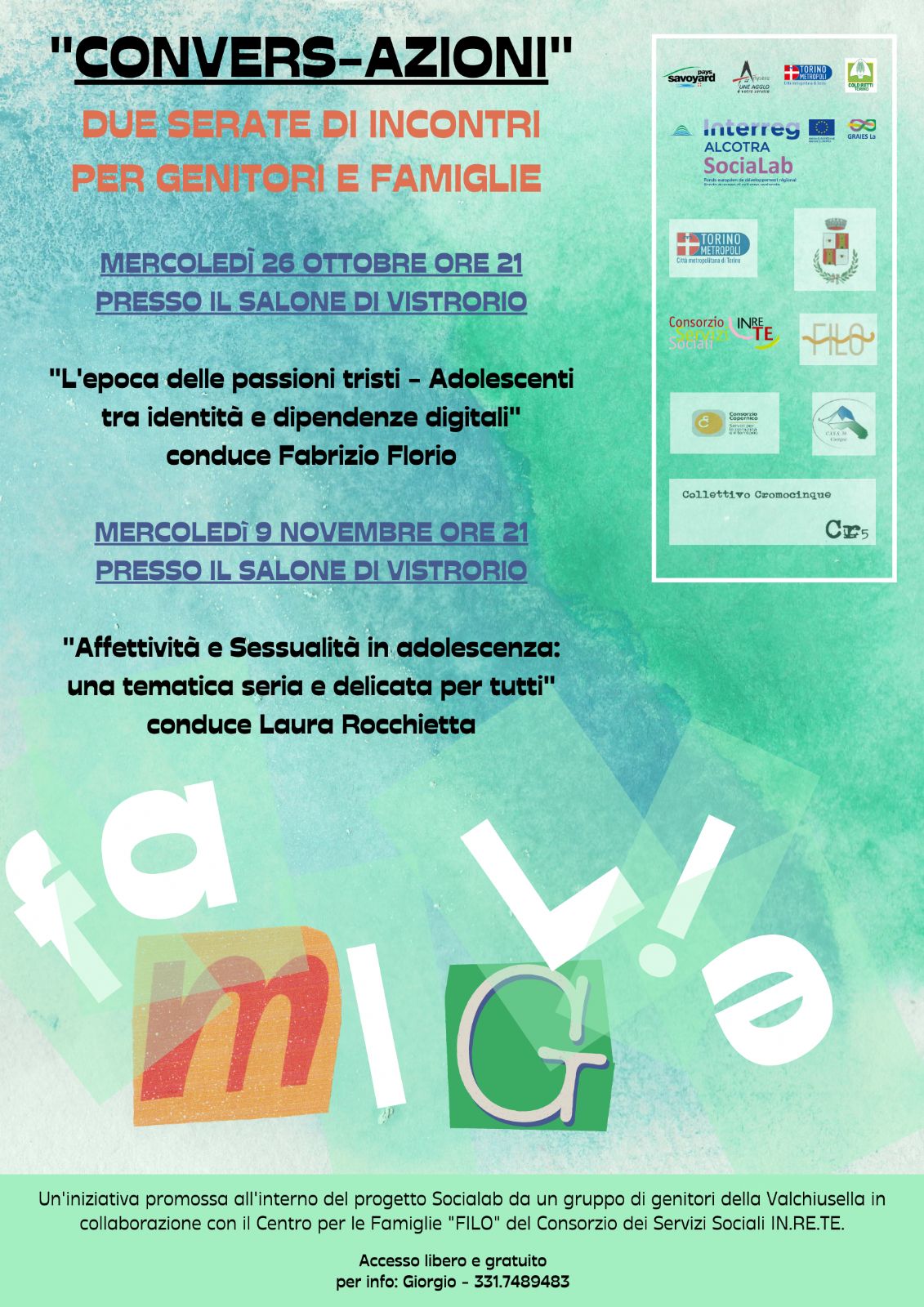 LE SERATE SONO PROMOSSE ALL'INTERNO DEL PROGETTO "SOCIALAB" DAL CONSORZIO IN.RE.TE. ATTRAVERSO IL CENTRO PER LE FAMIGLIE F.I.L.O. E IDEATE DA UN GRUPPO DI GENITORI DELLA VALCHIUSELLA.