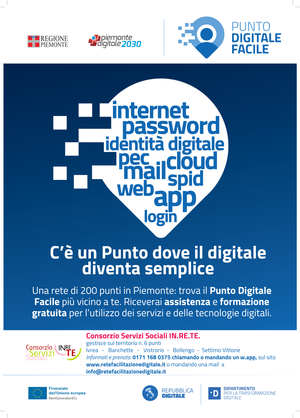 Il servizio è stato attivato grazie alla partecipazione del Consorzio IN.RE.TE., in qualità di soggetto sub-attuatore, al bando della Regione Piemonte: "Bando regionale non competitivo per l'attuazione della Misura 1.7.2. del PNRR: costituzione di reti locali di facilitazione digitale" finanziato dal Ministero per la Transizione Digitale nell'ambito della "MISURA 1.7.2 del PNRR per la Transizione Digitale".