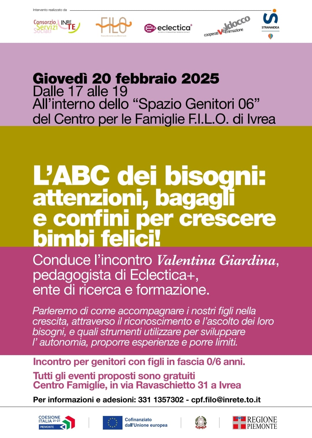 I primi due incontri si rivolgono uno a genitori con figli di età compresa tra i 6 e i 12 anni ("Navighiamo insieme: i bisogni come bussola tra l'infanzia e la preadolescenza") e uno a genitori con bimbi di età 0-6 anni ("L'ABC dei bisogni: attenzioni, bagagli e confini per crescere bimbi felici!")