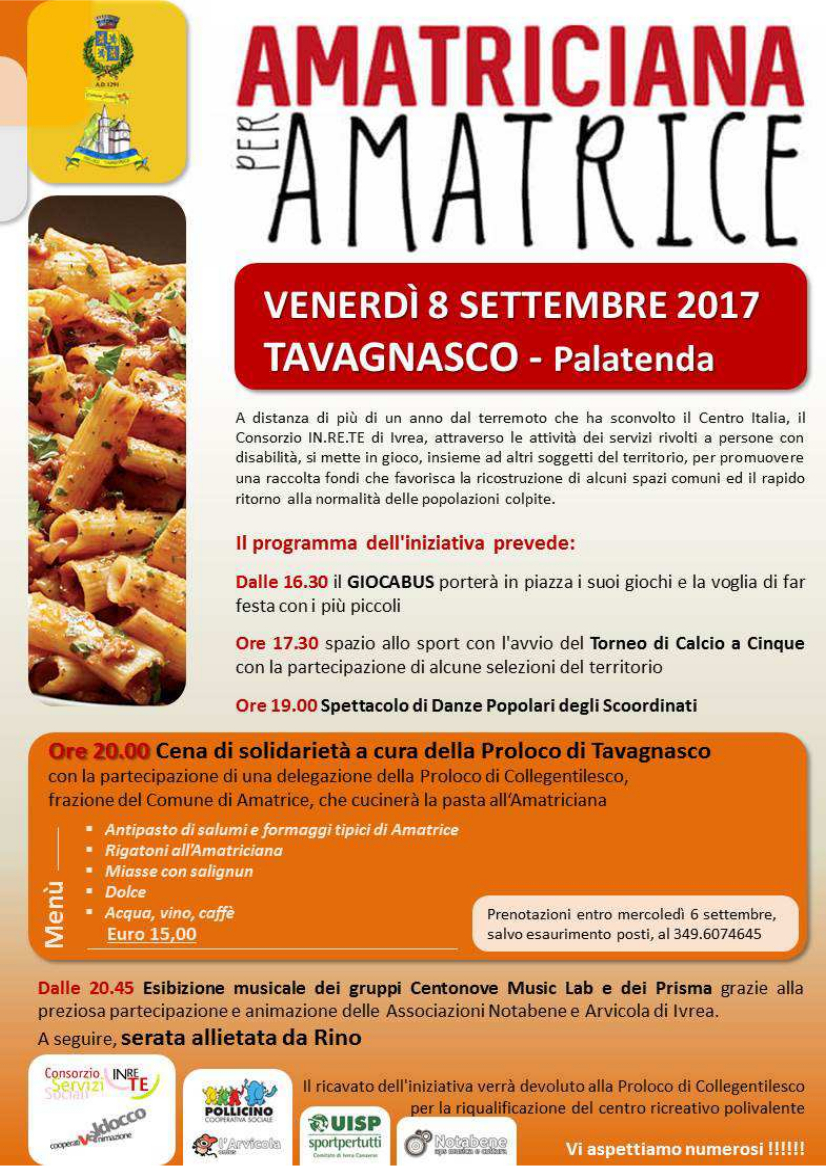 ore 20.00 Cena di solidarietà a cura della Proloco di Tavagnasco, con la partecipazione di una delegazione della Proloco di Collegentilesco, fraz. del Comune di Amatrice, che cucinerà la pasta all'Amatriciana.