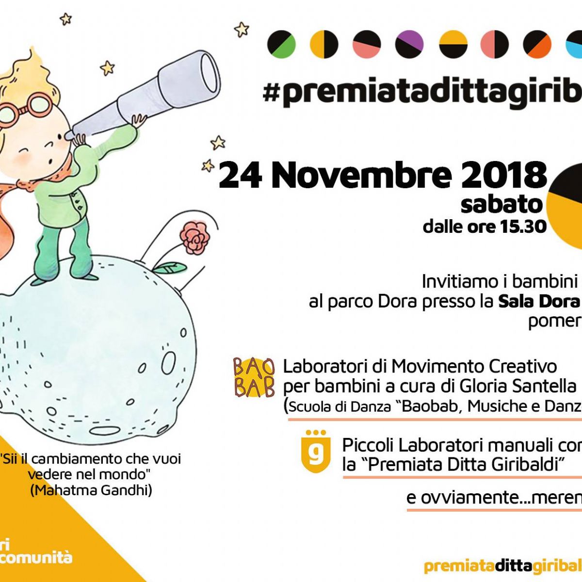 Invitiamo i bambini e le loro famiglie SABATO 24 NOVEMBRE dalle ore 15.30 al parco Dora presso la Sala Dora Baltea per un pomeriggio insieme. Cosa faremo? Laboratori di Movimento Creativo per bambini a cura di Gloria Santella (Scuola di Danza Spazio Baobab Ivrea). Giochi di movimento per divertirsi attraverso l'espressione di sè; Piccoli Laboratori manuali con la Premiata Ditta Giribaldi ...e ovviamente una bella merenda insieme!