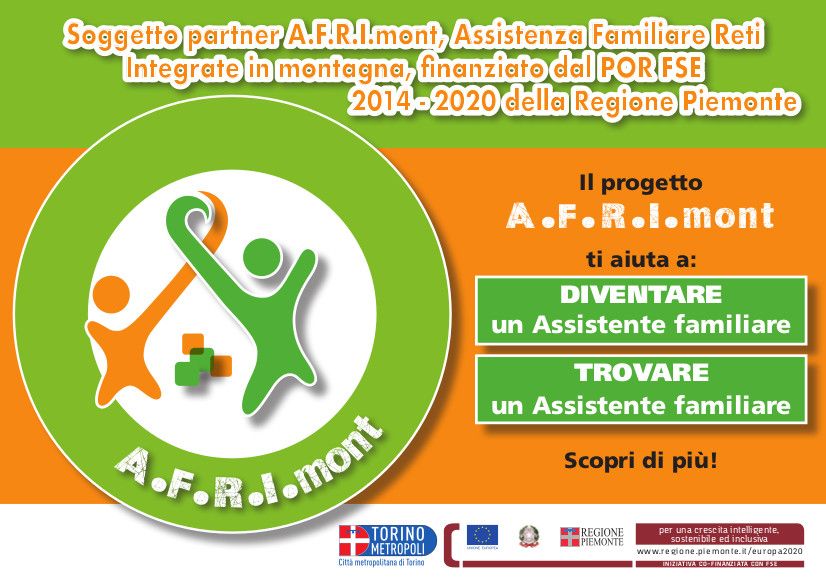 Dal 1 settembre al 31 ottobre 2019 riaprono le iscrizioni al progetto AfriMont che offre gratuitamente percorsi di formazione volti al raggiungimento della qualifica professionale di "Assistente Familiare", azioni di supporto all'inserimento lavorativo dell'assistente familiare in famiglie del territorio e incentivi economici per le famiglie che, avendone i requisiti, assumeranno un/una assistente famigliare tramite il progetto.