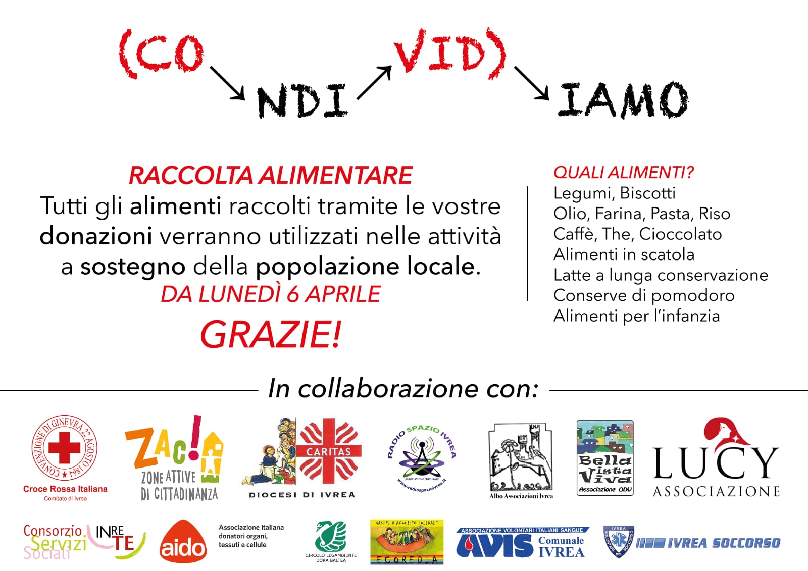 È partita oggi 6 aprile l'iniziativa di Raccolta Alimentare "COndiVIDiamo", che permette a chi lo desidera di donare alimenti e generi di prima necessità a chi in questo delicato momento si trova in grande difficoltà. L'iniziativa è promossa dalla Croce Rossa Italiana Comitato d'Ivrea, Caritas, il nostro Consorzio e da molteplici associazioni territoriali ed ha raccolto finora l'adesione dei seguenti punti vendita: