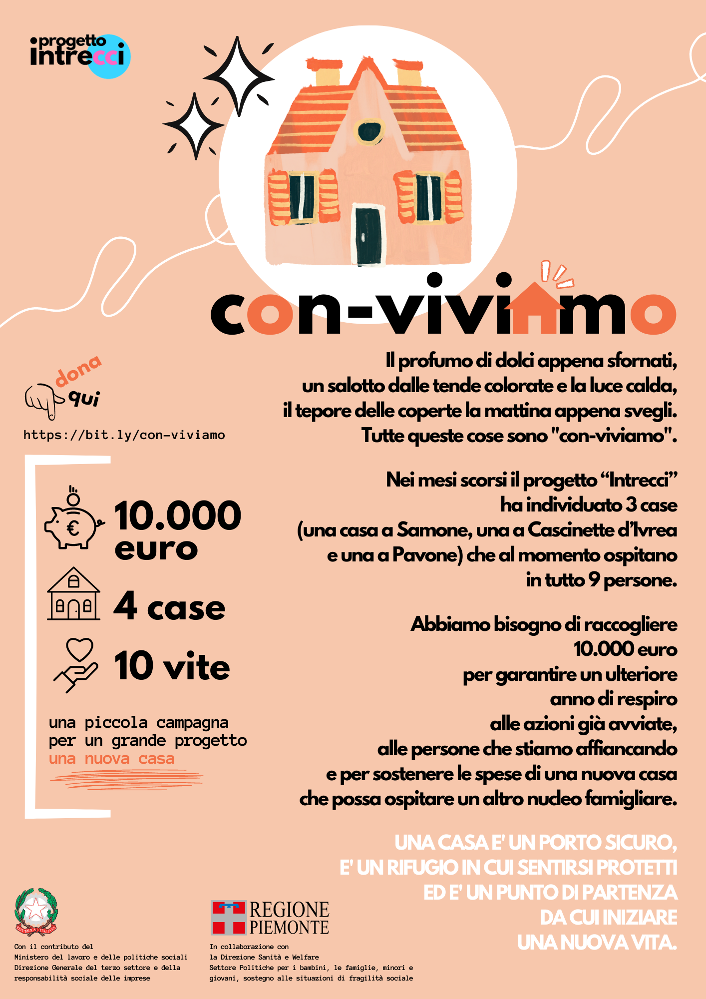 Fondazione di Comunità del Canavese con il Consorzio In.Re.Te e gli altri partner del progetto “Intrecci. Percorsi di inclusione e solidarietà” promuove la raccolta fondi "CON-VIVIAMO", un'iniziativa che vuole farsi carico del fenomeno dell’emergenza abitativa individuando case e alloggi nei Comuni canavesani da mettere a disposizione di nuclei famigliari in difficoltà, supportandoli nella gestione economica dell’affitto, delle spese e dell’arredo.