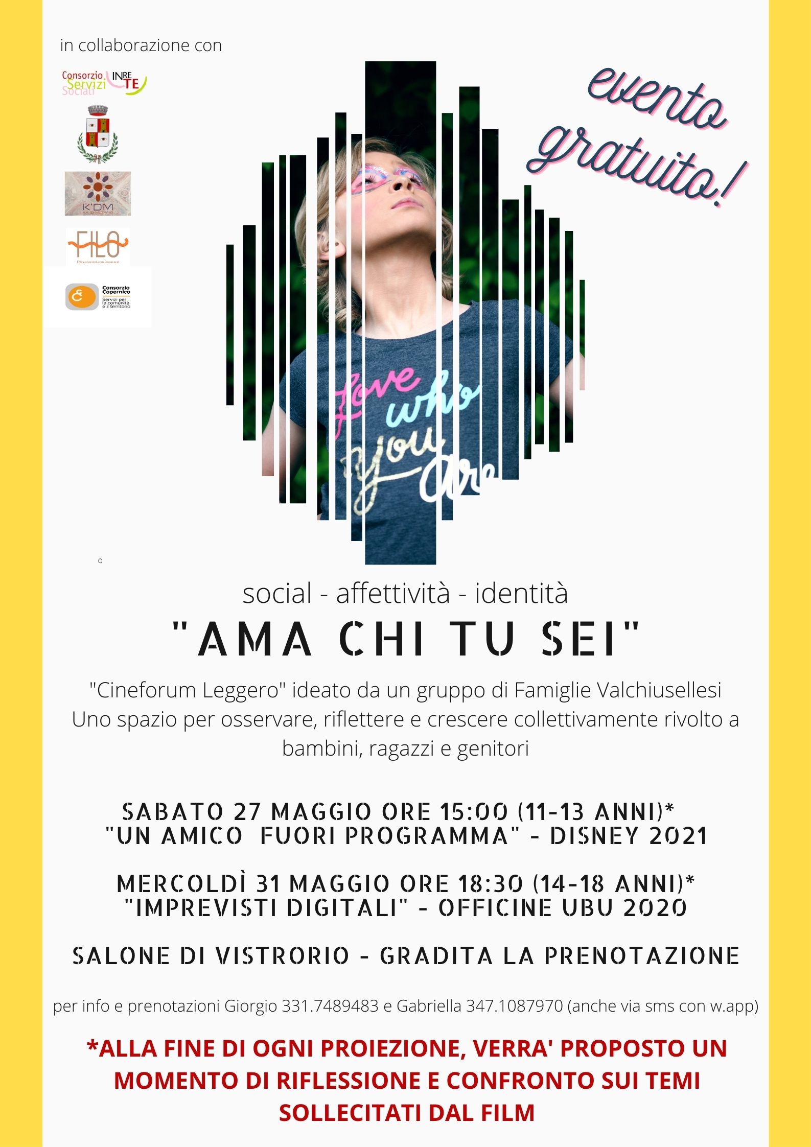"CineForum leggero" rivolto a bambini, ragazzi e genitori per confrontarsi e riflettere sul tema del mondo digitale, del suo utilizzo e della costruzione di singole identità soggettive (tanto dei figli come dei genitori) attraverso la proiezione di film e un successivo breve confronto.