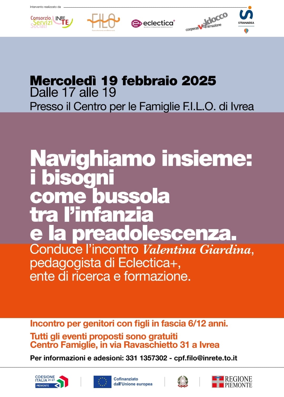 I primi due incontri si rivolgono uno a genitori con figli di età compresa tra i 6 e i 12 anni ("Navighiamo insieme: i bisogni come bussola tra l'infanzia e la preadolescenza") e uno a genitori con bimbi di età 0-6 anni ("L'ABC dei bisogni: attenzioni, bagagli e confini per crescere bimbi felici!")